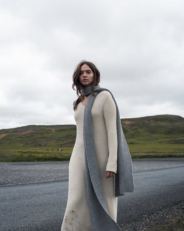 The pearl knit scarf is produced in the same colors as the Everyday Dress and Essential Dress, with the intention of easy pairing to transform a look or when extra warmth is needed.